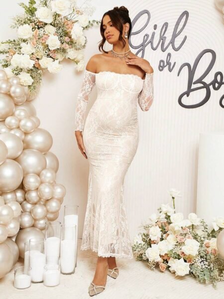 Renta Vestido Maternidad Elegante Blanco Encaje Modelo 45