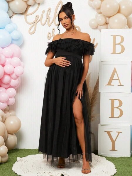 Renta Vestido Maternidad Elegante Negro con Tul Modelo 44