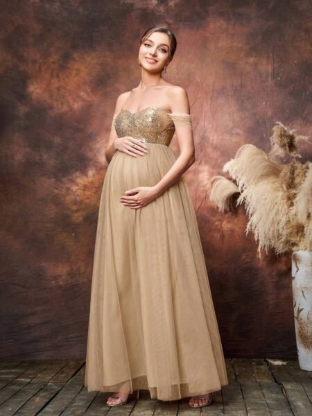 Renta Vestido Maternidad Fiesta Elegante Beige con lentejuela Modelo 42