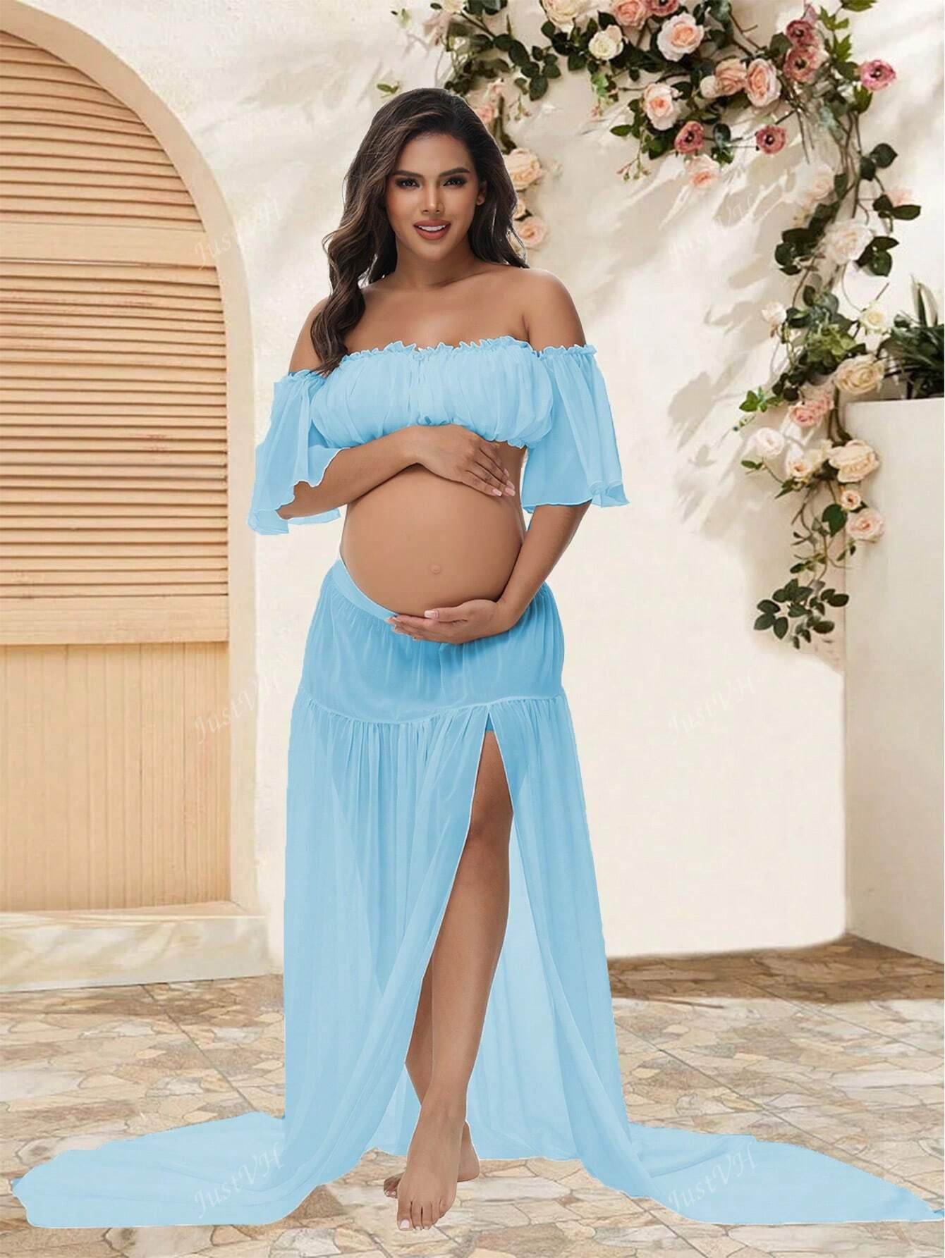 Luce espectacular en tu sesión de fotos o baby shower con este conjunto de maternidad de dos piezas. El top tubo de gasa con mangas de volantes añade un toque de elegancia, mientras que la falda con abertura garantiza comodidad y estilo.