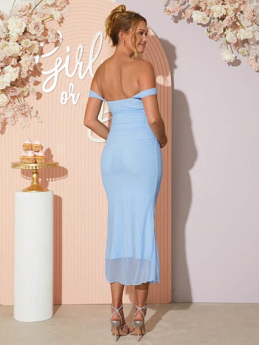 Vestido de maternidad tipo cola de pez con hombros descubiertos, ideal para lucir elegante en tu Baby Shower. Diseñado para resaltar la figura de la mujer embarazada con comodidad y estilo, perfecto para sesiones de fotos, baby showers o eventos especiales.