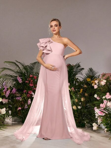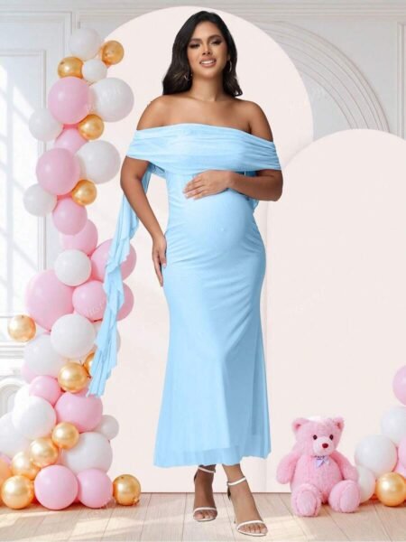Luce radiante en tu fiesta de maternidad con este elegante vestido formal. Diseñado con un escote descubierto que realza tu belleza natural, presenta delicadas aplicaciones en el cuerpo y un contraste de tul en el bajo que añade un toque de sofisticación.