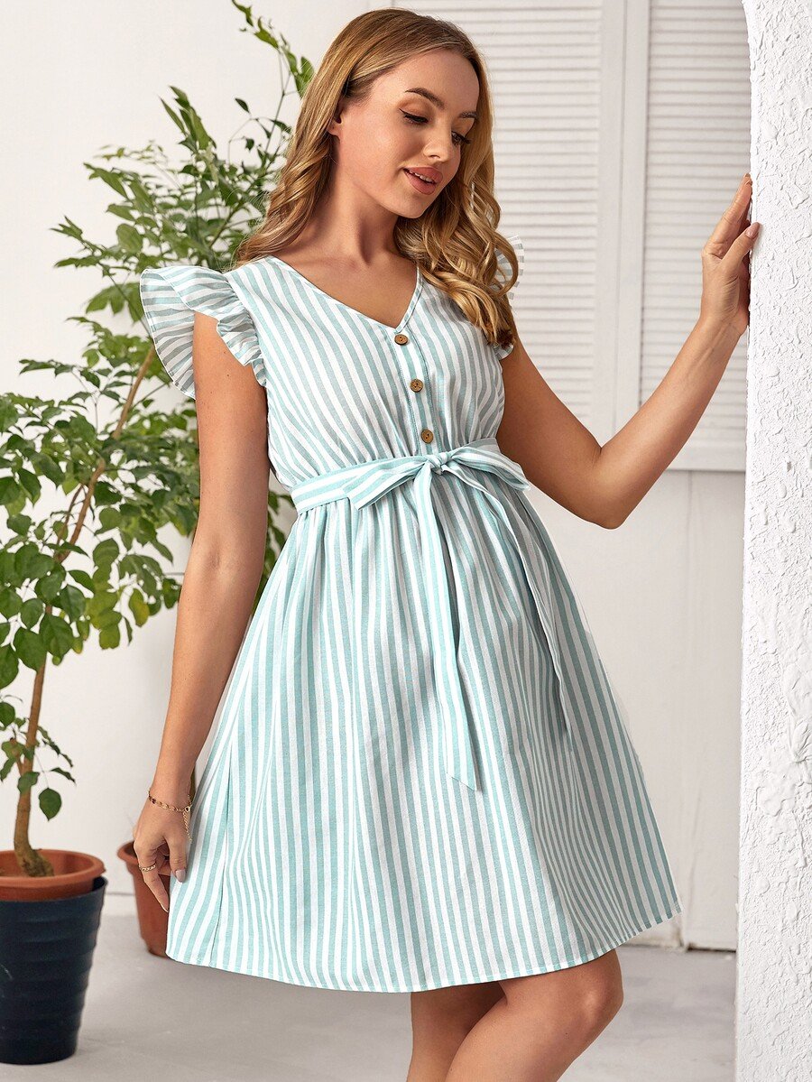 Este vestido no solo destaca por su diseño atemporal, sino también por sus detalles cuidadosamente pensados. Su lazo ajustable permite personalizar el entalle, asegurándose de que se adapte perfectamente a tu cuerpo en evolución. Además, las mangas con volantes añaden un toque romántico y femenino, ideales para cualquier ocasión, ya sea un almuerzo casual o un evento más especial.