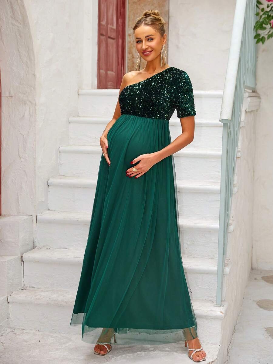 Confeccionado para adaptarse a las diferentes etapas del embarazo, el vestido cuenta con un ajuste flexible que se adapta cómodamente a tu cuerpo. La malla en contraste forma un diseño único y favorecedor, mientras que las lentejuelas añaden un toque brillante y llamativo. Ideal para una fiesta, boda, o cualquier ocasión especial, este vestido combina perfectamente estilo y funcionalidad.